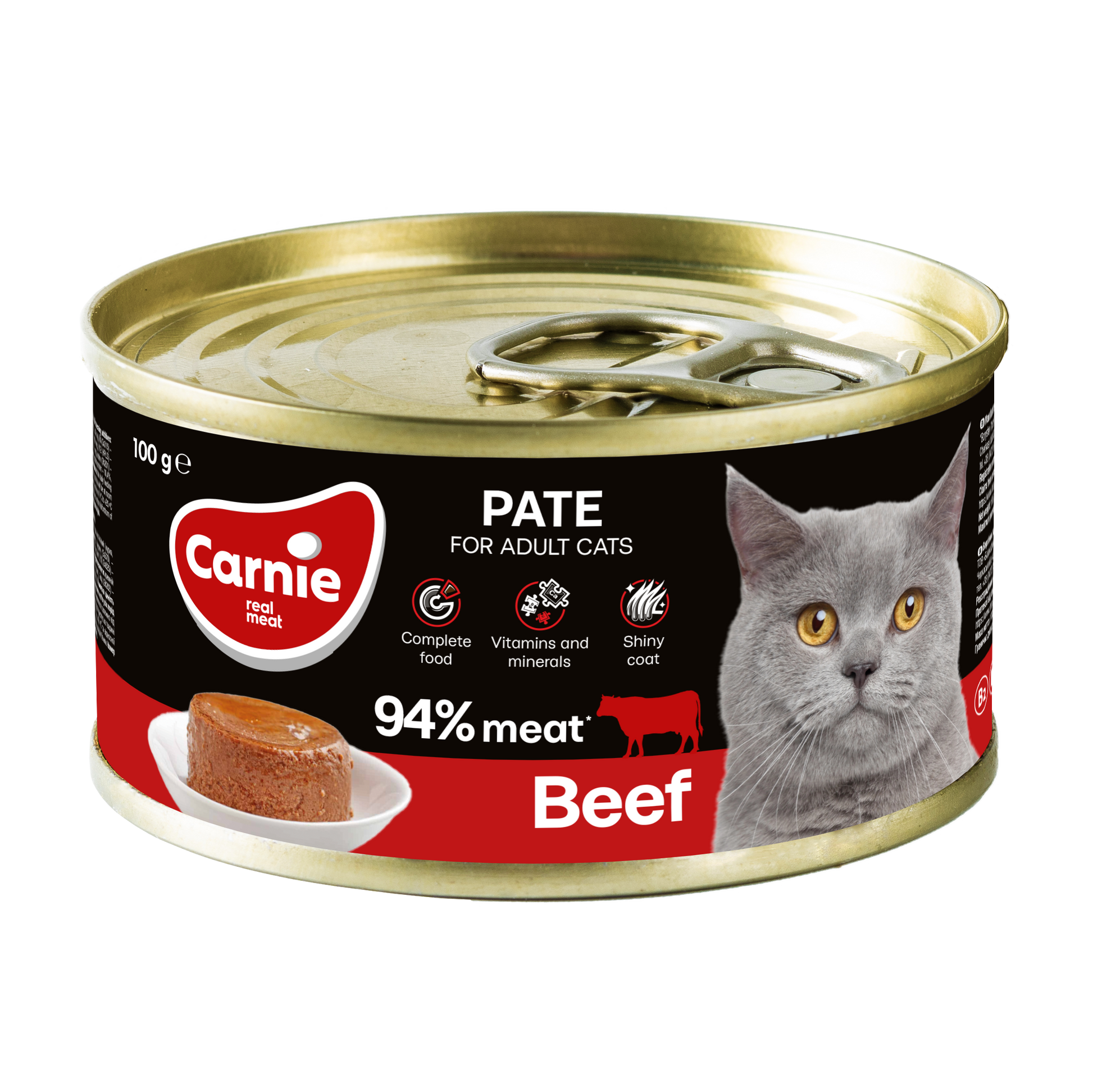 Kaķu konservi pieaugušiem kaķiem pastēte ar liellopa gaļu, gaļa 94% 100g
