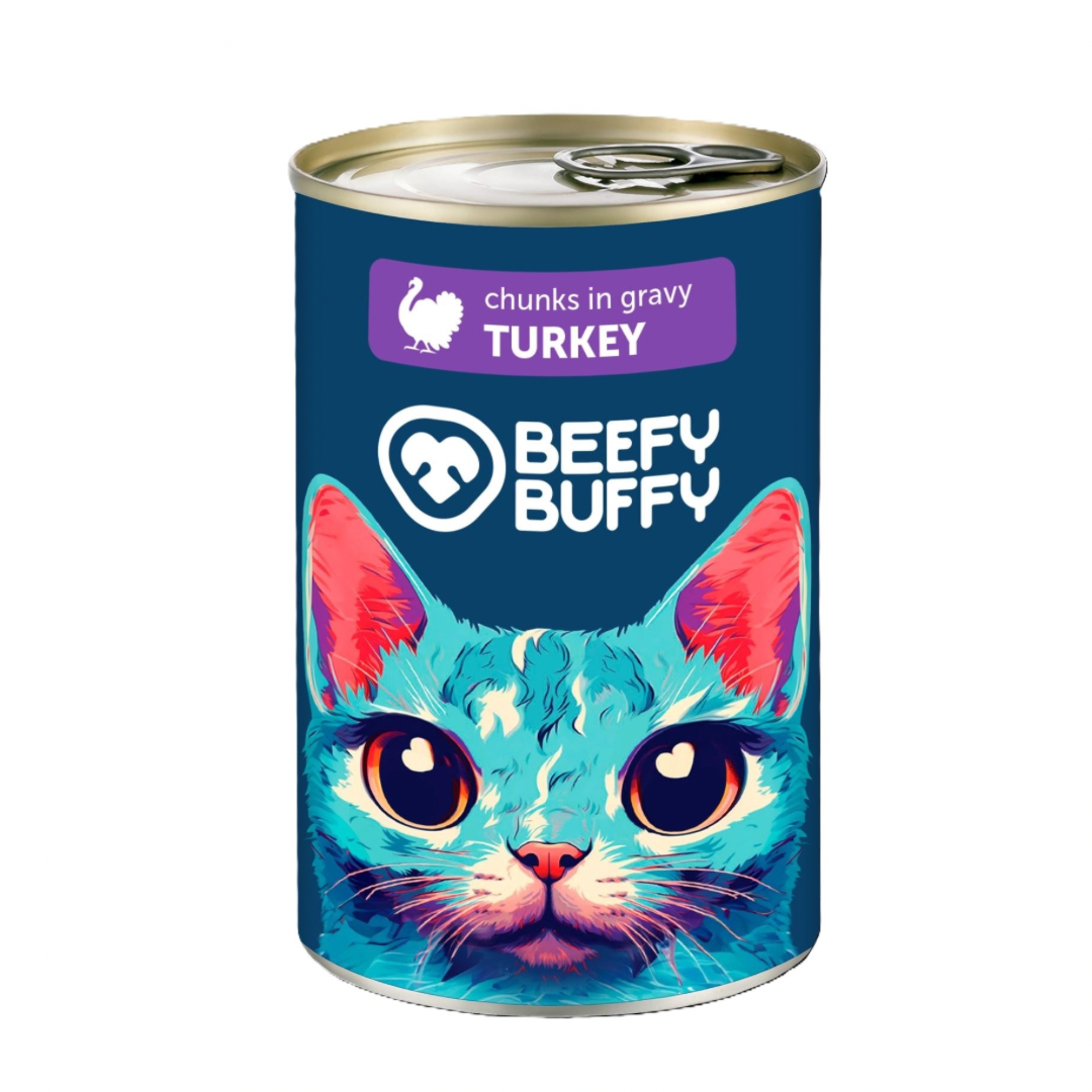 Kaķu konservi pieaugušiem kaķiem gaļas gabaliņi mērcē ar tītaru, gaļa 72% 415g
