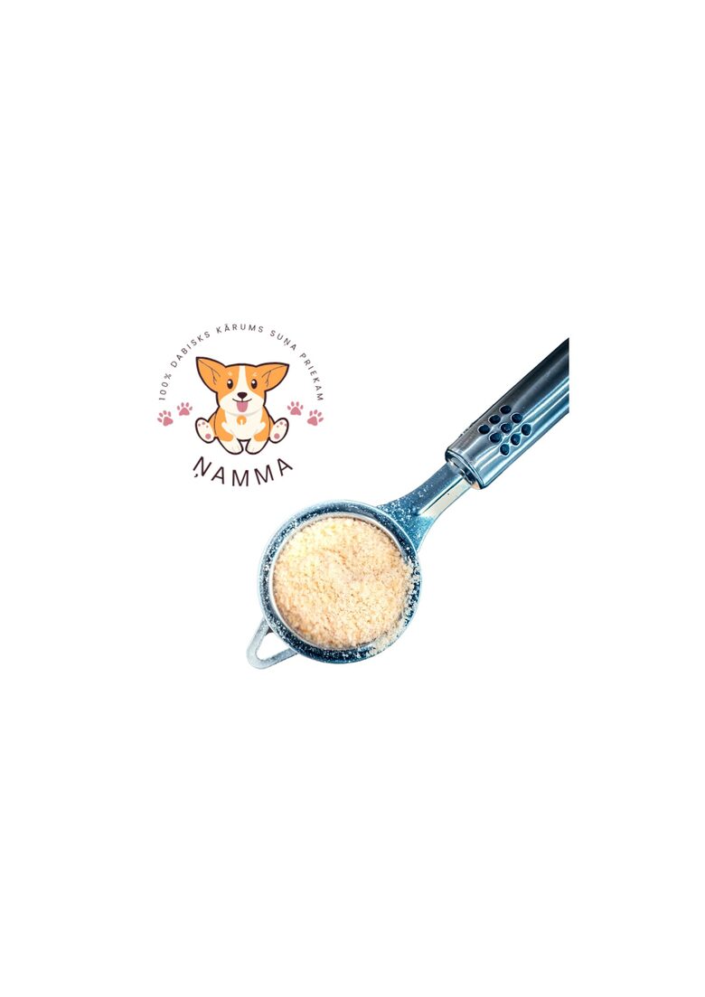 Siera pulveris – tas ir pilnīgi dabisks produkts, kas izgatavots no organiskām sastāvdaļām bez konservantiem vai ķimikālijām. Šī papildbarība ir lieliski piemērota suņiem, kuri tiek baroti ar jebkāda veida diētu, jo tās dienas devai pievieno minimālu papildu kaloriju daudzumu, kā arī nodrošina veselīgu olbaltumvielu daudzumu, kas nepieciešama jūsu mājdzīvnieka augšanai. Tas ir lielisks papildinājums jūsu suņiem, piedāvājot tiem iecienītāko siera garšu kopā ar barību.