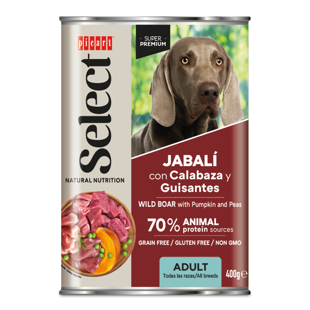 Suņu konservi pieaugušiem suņiem ar meža cūkas gaļu, ķirbjiem un zaļajiem zirnīšiem 400g